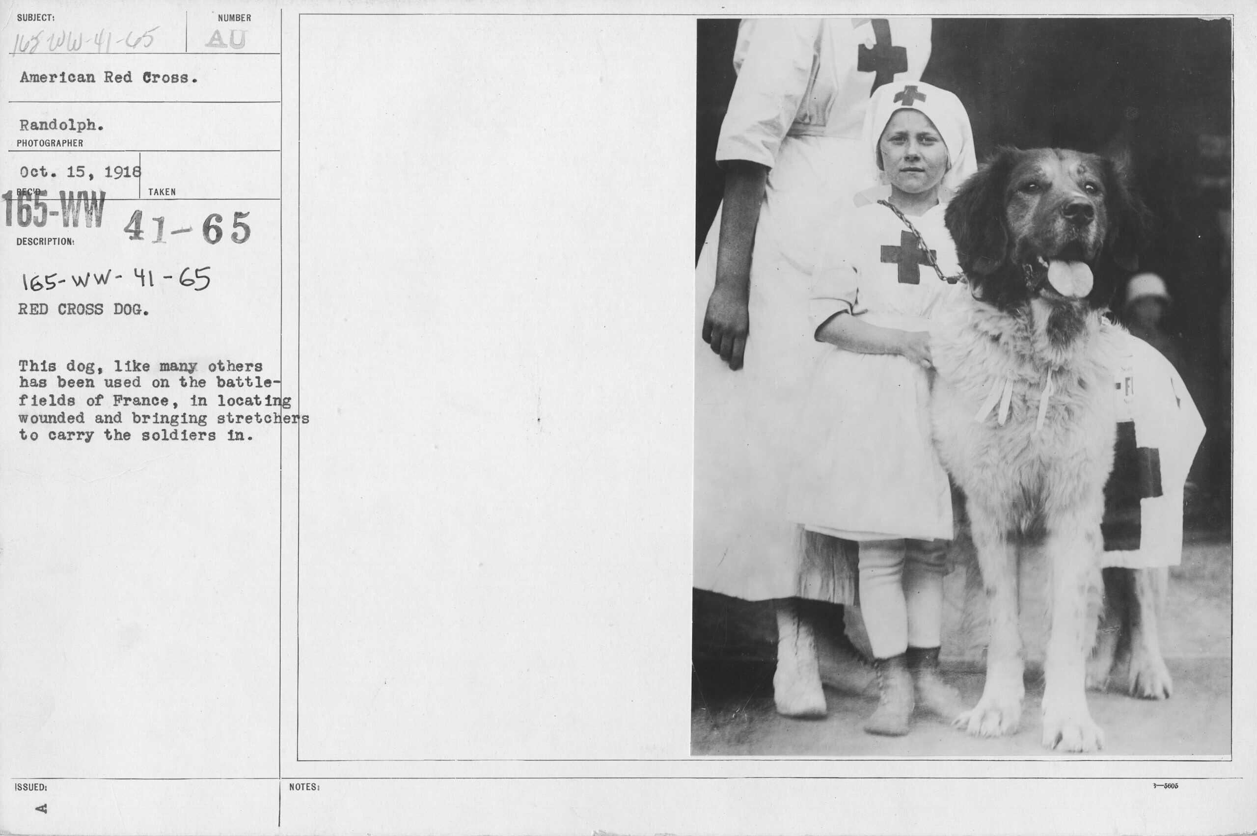 “This dog, like many others has been used on the batter fields of France, in locating wounded and bringing stretchers to carry to the soldiers in.” – Caption